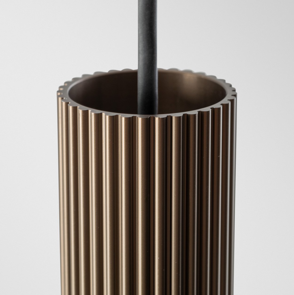 Extruded Stripped shows a different kind of minimalism. One with a strong presence, but that can also seemingly disappear. Nothing but a vertical line and a flood beam will betray its presence. This bold luminaire shed its light cone and top hook to show nothing but its ribbed play with shadow and light. Play with strong lines, as stand alone pendant or on our popular Pista Track 48V.